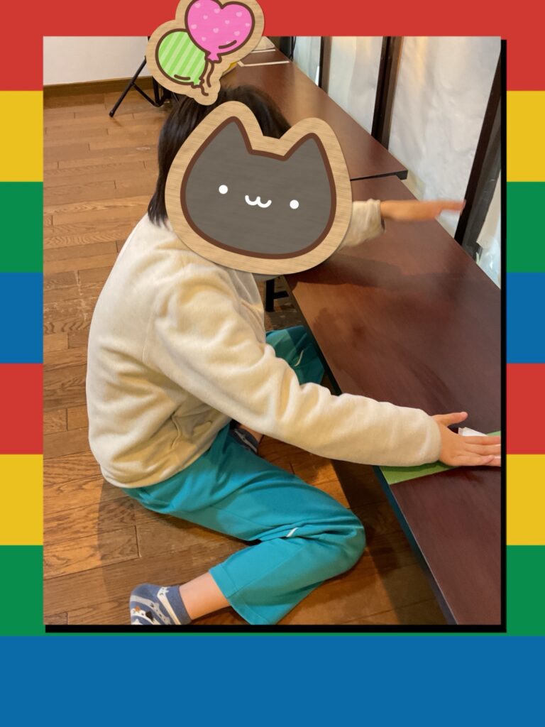 机拭きの様子です。おやつの後など使った机を端から端まで拭いてくれました。次に使う人も気持ちが良いですね。