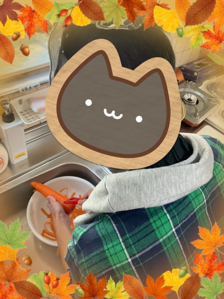 まずカレーの具材の皮を剥いています。慣れたもので具材を全部剥くことができましたよ‼️