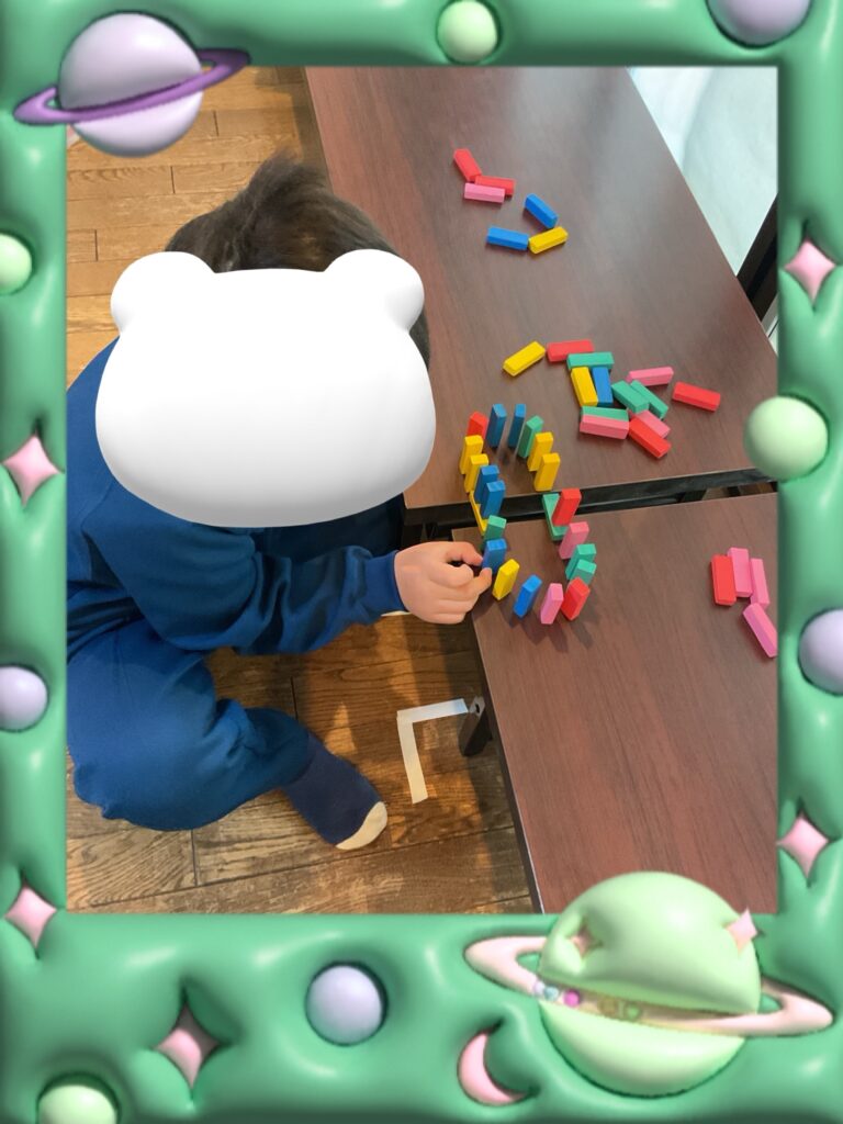 勉強を終わらせてブロックで遊んいます。「何してる?」と聞いたら「ドミノを作っている」と答え1つ1つ地道に並べて遊んでいました🎶