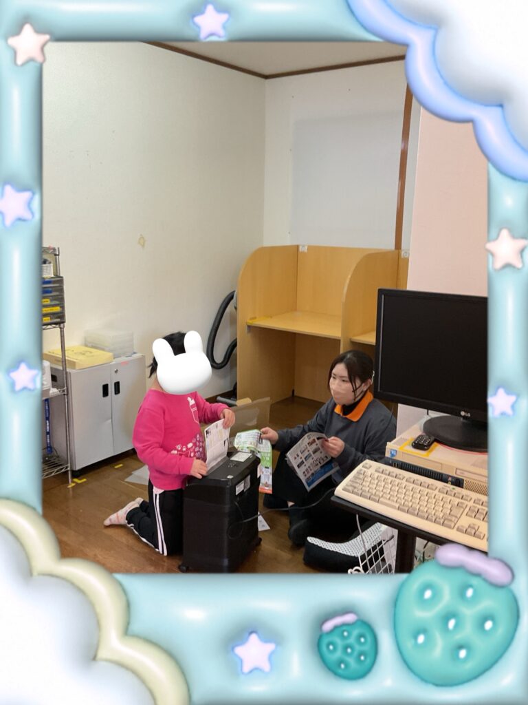 シュレッダーのお手伝いをしてます。スタッフが千切っていく紙を取りシュレッダーの中に1枚ゆっくり入れて安全に行なっていました^_^