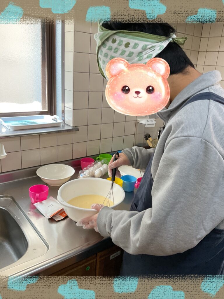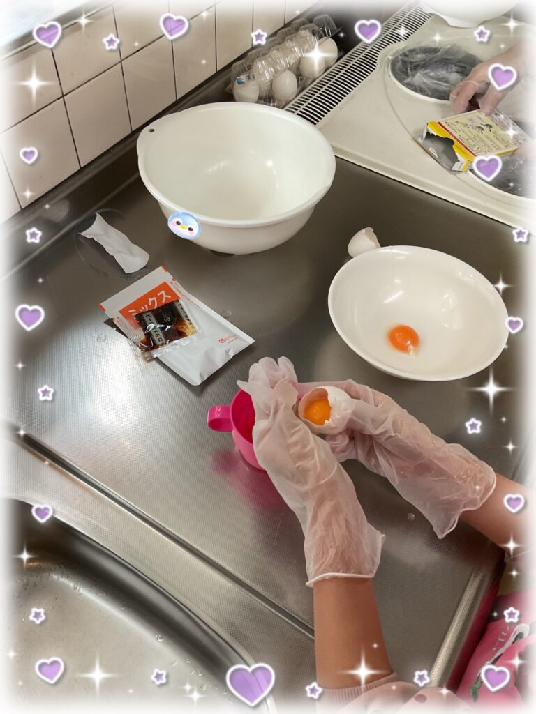 玉子を割る人が玉子を手際良く割っていってます。玉子を割り終えたら材料を混ぜる子どもたちにバトンタッチしてしました☆