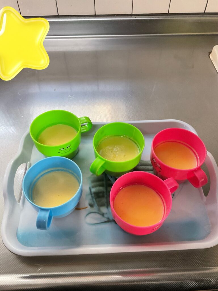 子どもたちたちが作り上げたプリンで〜す。キレイに美味しく出来上がり甘い良い匂いが漂っていました!