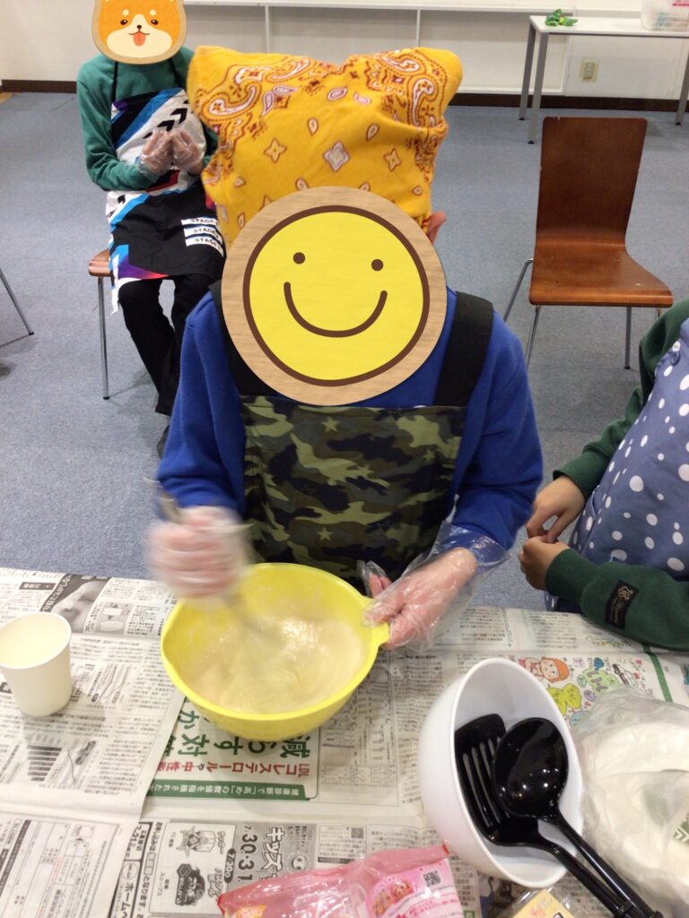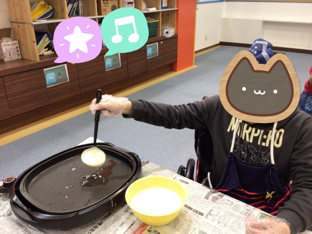 おやつでホットケーキを作りました。卵を綺麗に割って混ぜることができました。