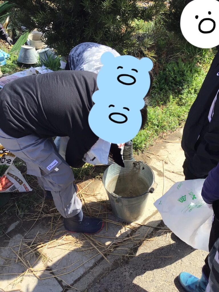 これから植えるじゃがいもの種の肥料や土を用意しています。