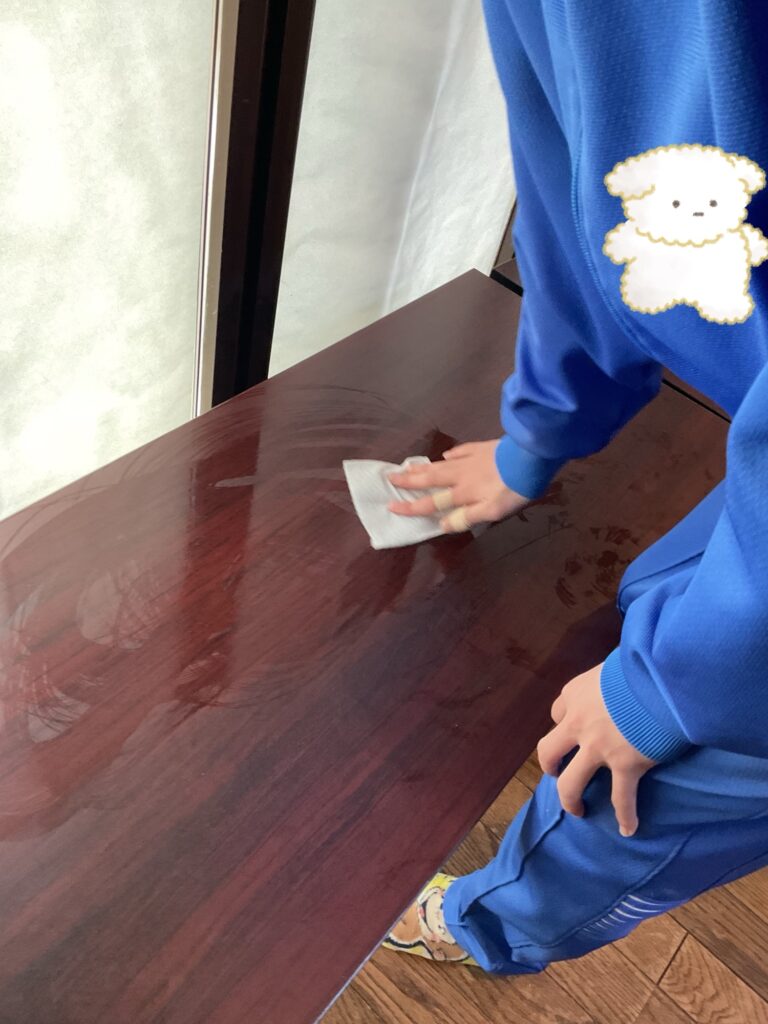 自分たちで作ったアルコールペーパーで机を使った度に消毒を行い、机を清潔に保つ様に心がけていますね^_^