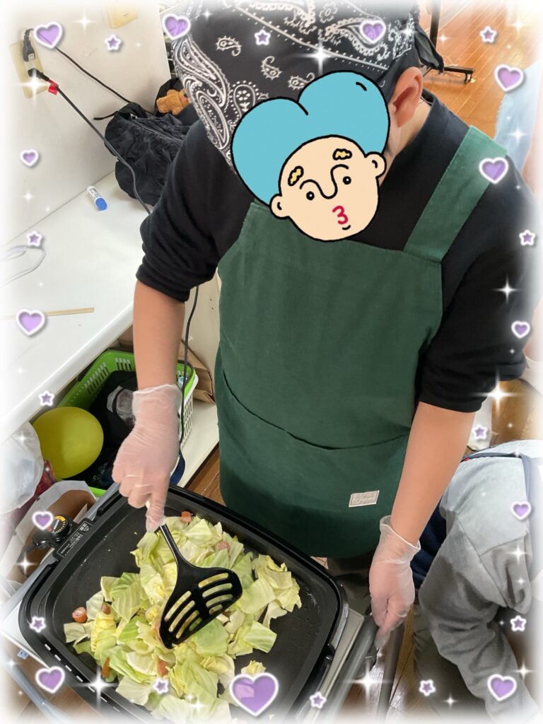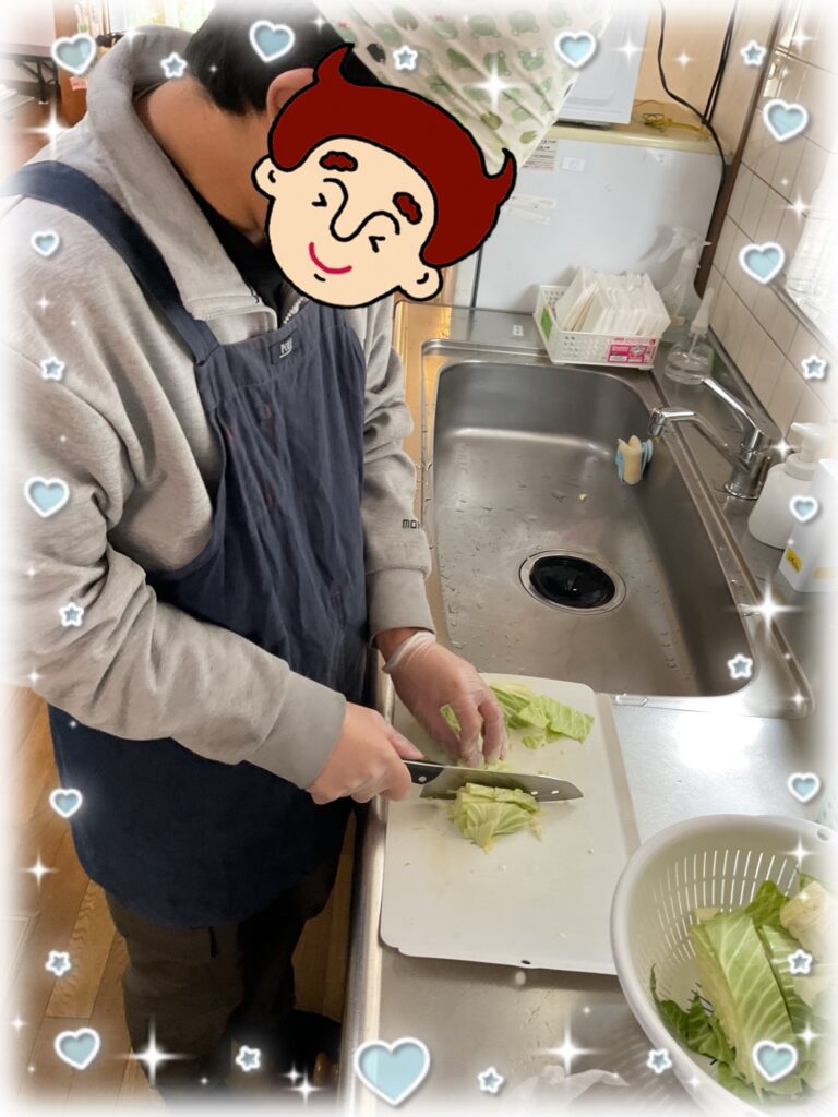 昼食作りでウインナーやキャベツをを切っていきます。キャベツが固かったので切るのが大変でしたが、何とか切ることができました☆