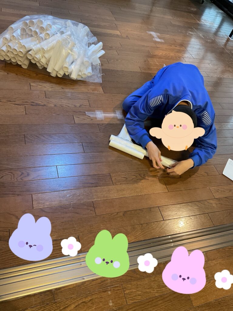 キッチンペーパーの芯を使い工作を行なっている様子です。